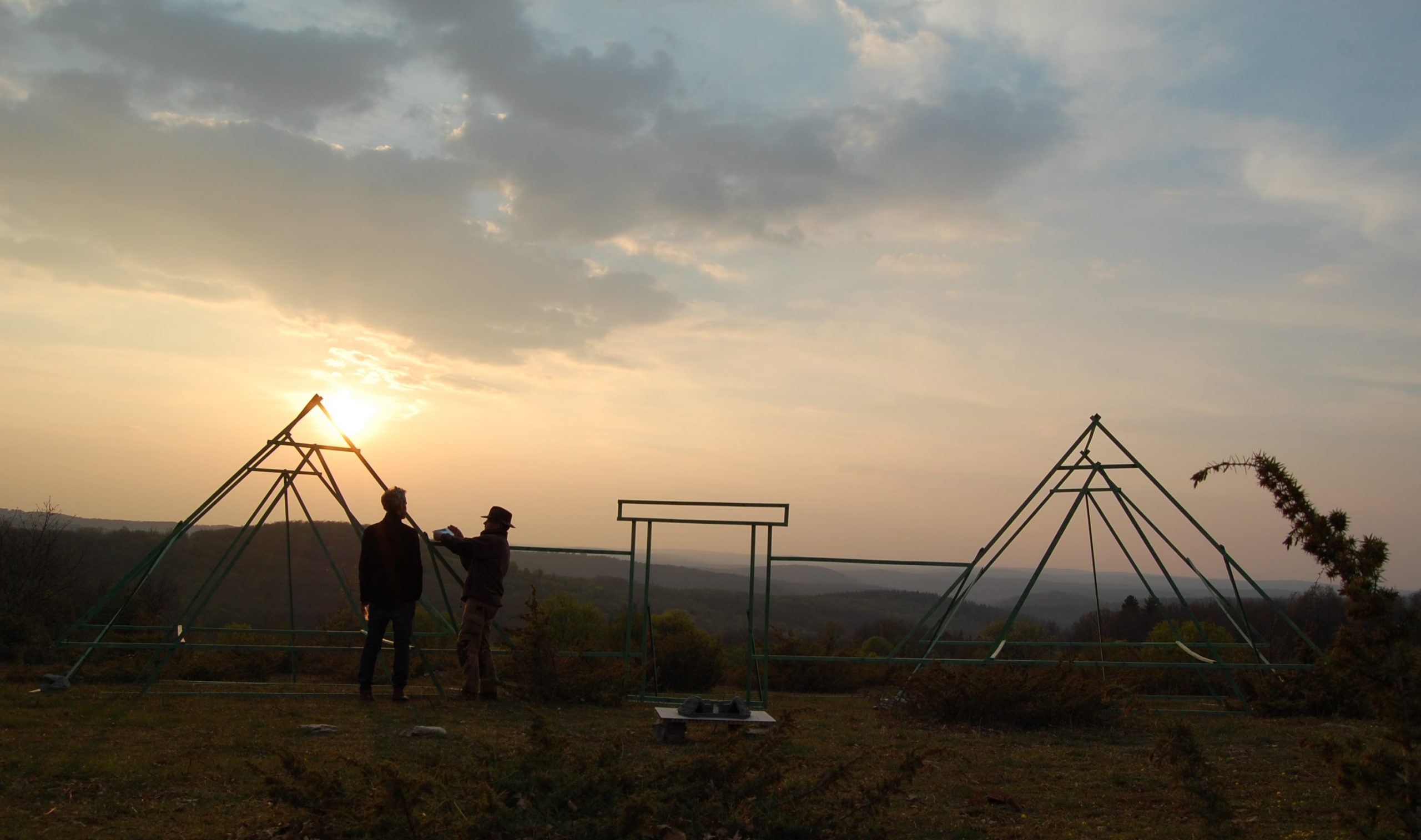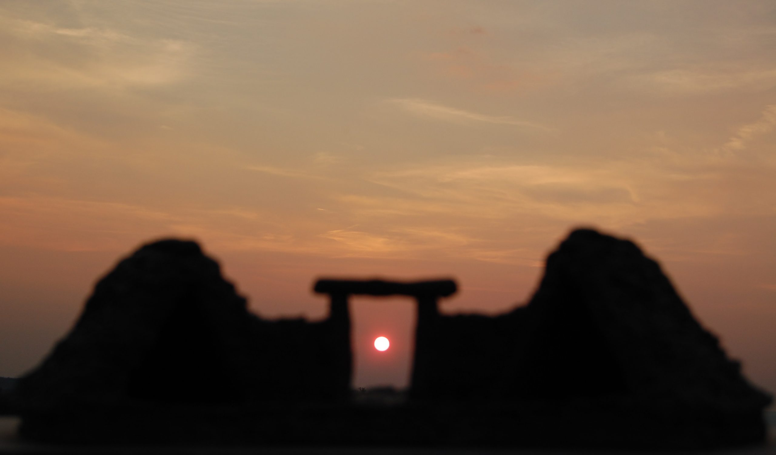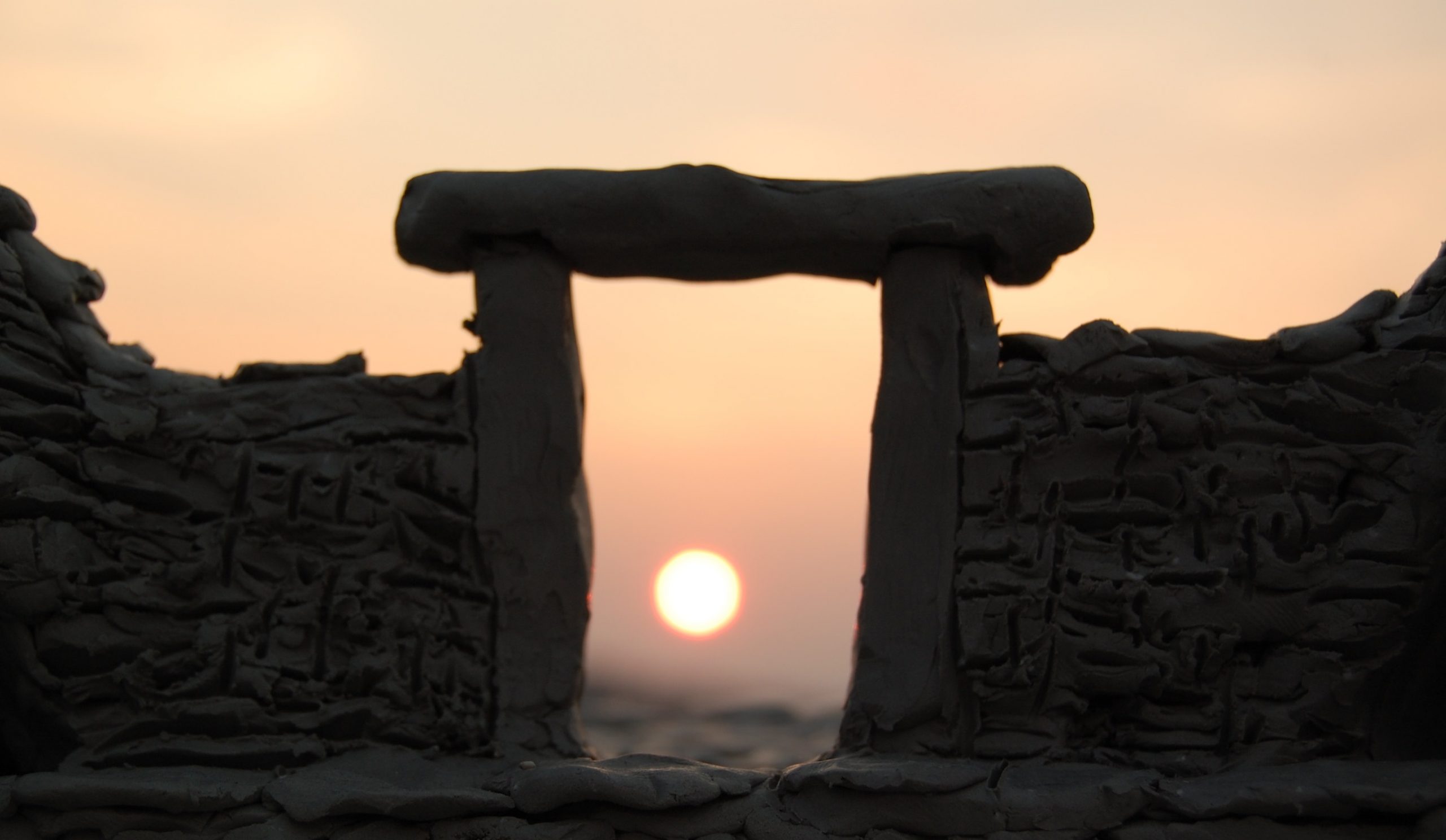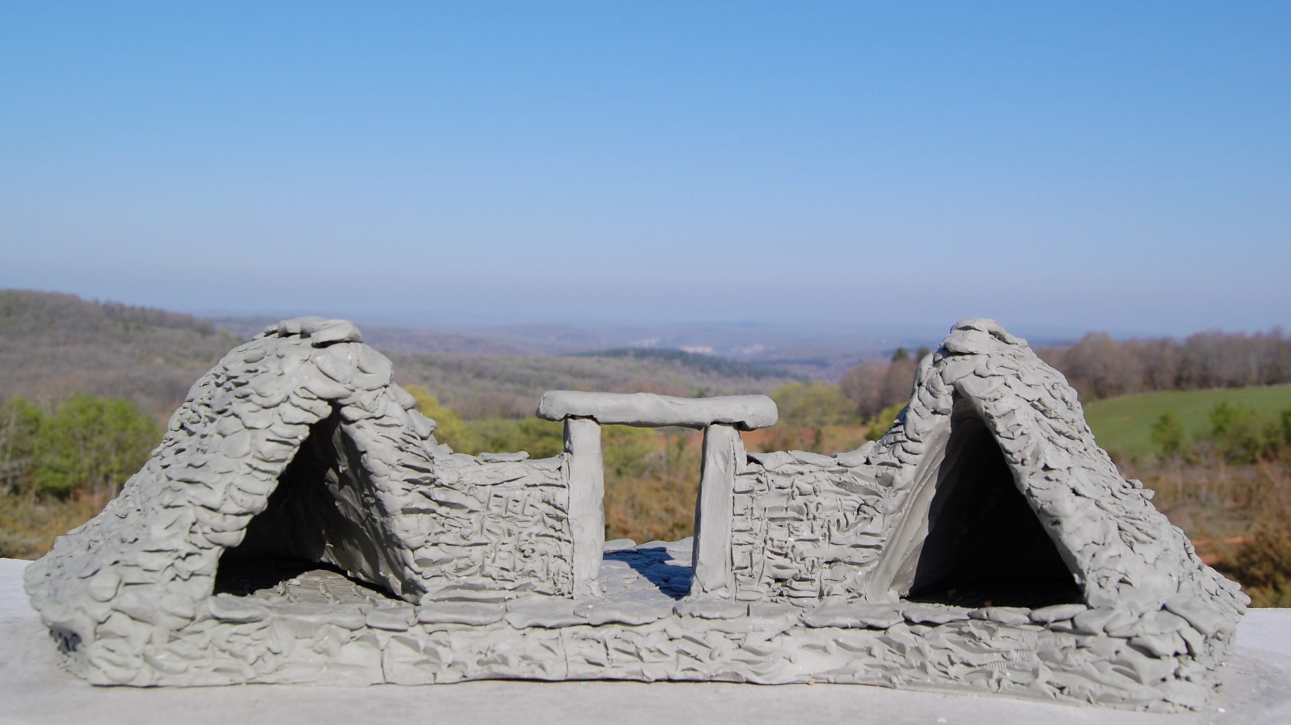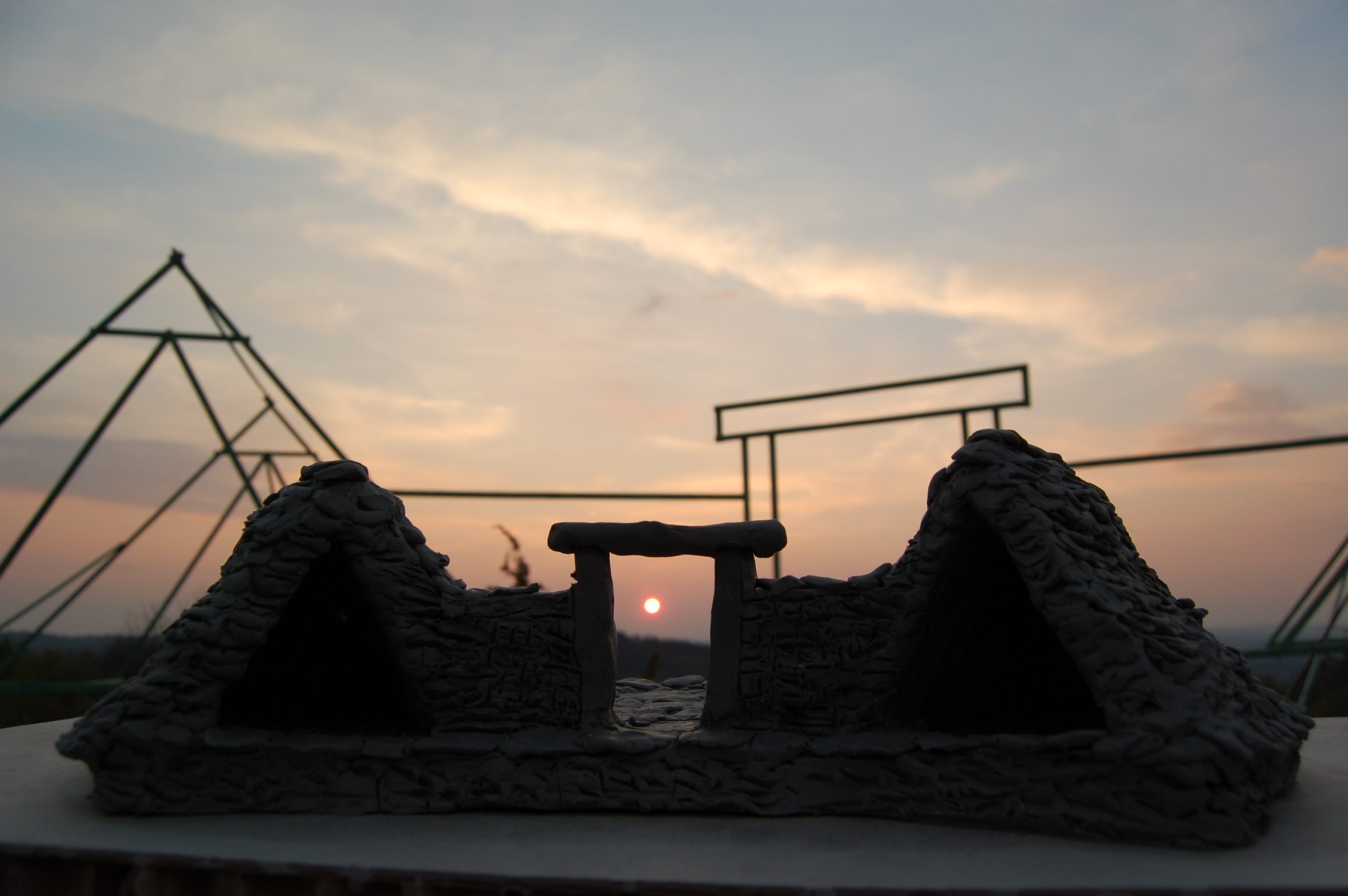 photos : maquette en bois maintenant disparue; maquette en pâte à modeler, qui donne une impression de ce que ça va devenir.: photos avec le couché du soleil, puisque le passage entre les deux ‘tentes’ en pierre est orienté sur le couché du solstice de l’été.