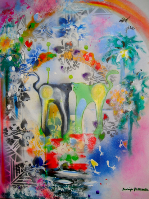 Peinture gestuelle, coloris denses, animaux, personnages et paysages imaginaires. Gaîté, douceur et humour au programme.