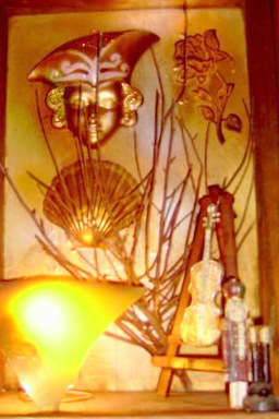 Tableaux abstraits et figuratifs, sculptures sur bois flottés et assemblages d’objets de récupération dans les coffrets éclairés des boîtes à rêves, nom de son invention.
