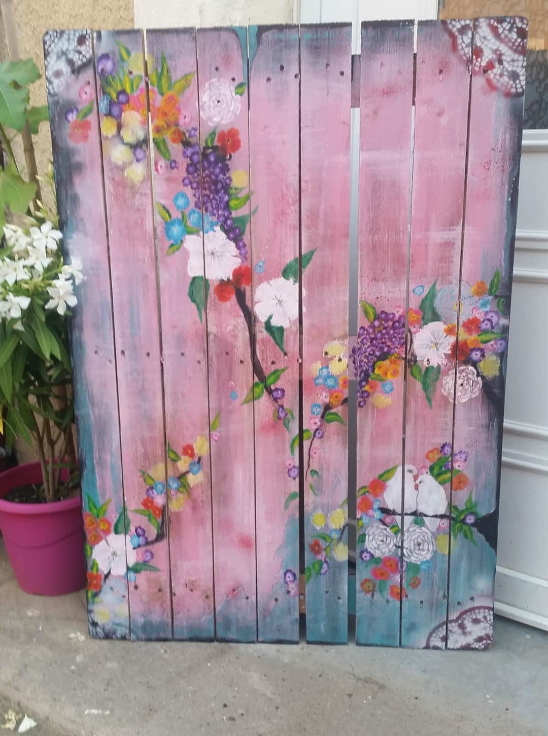 J’aime découvrir de nouvelles méthodes et techniques ça se retrouve dans mes œuvres, je peins sur tout support que je trouve, ça va être une planche en bois, un volet en bois, du placo, des palettes en bois, sur des meubles, objets ect.