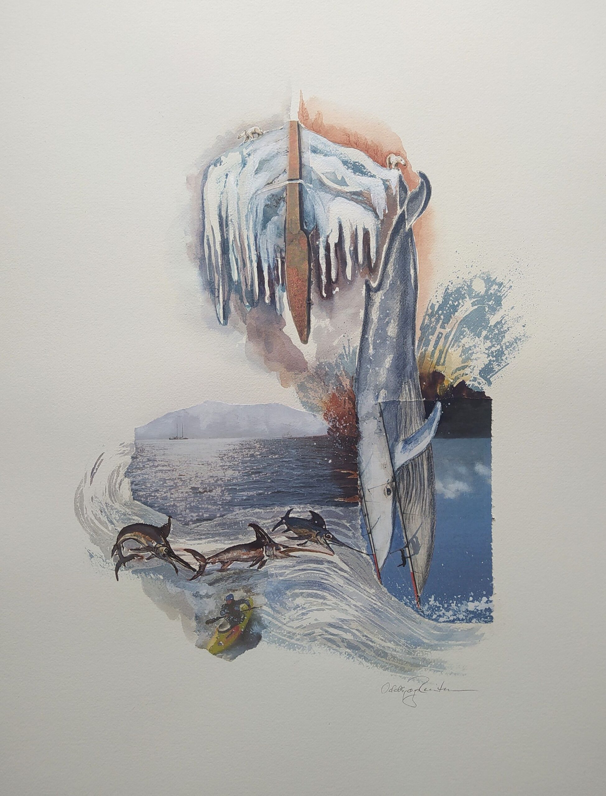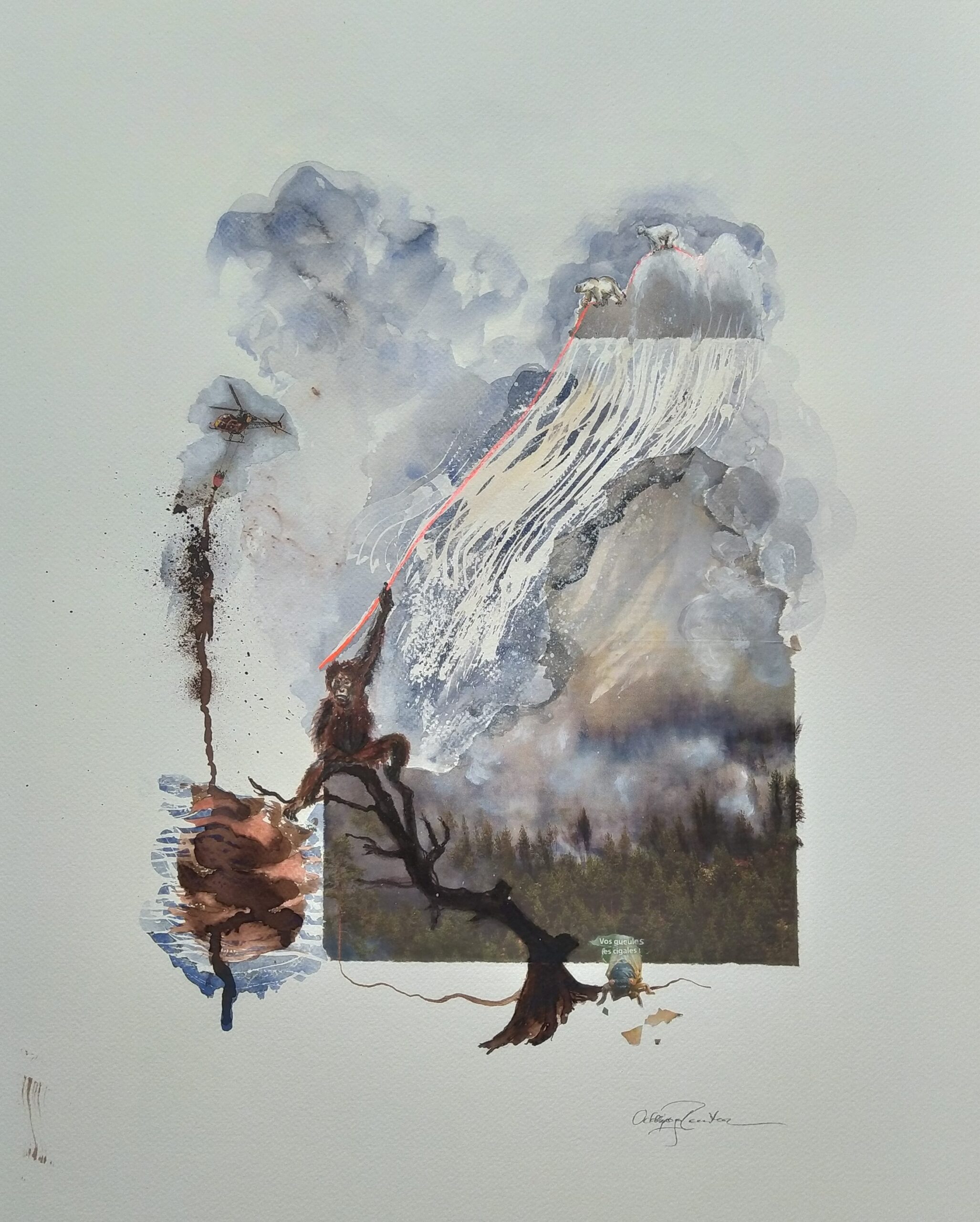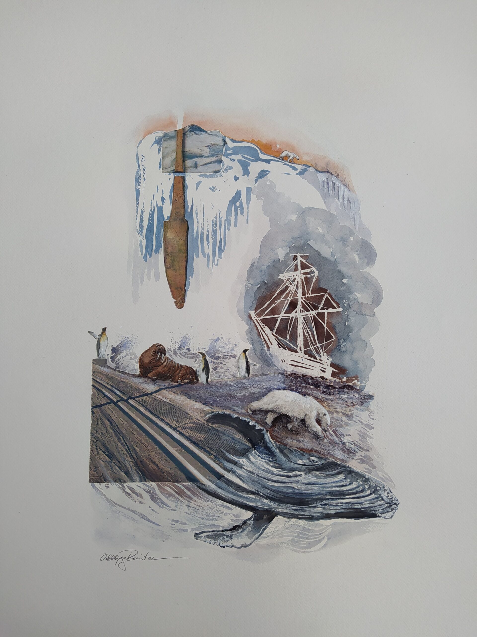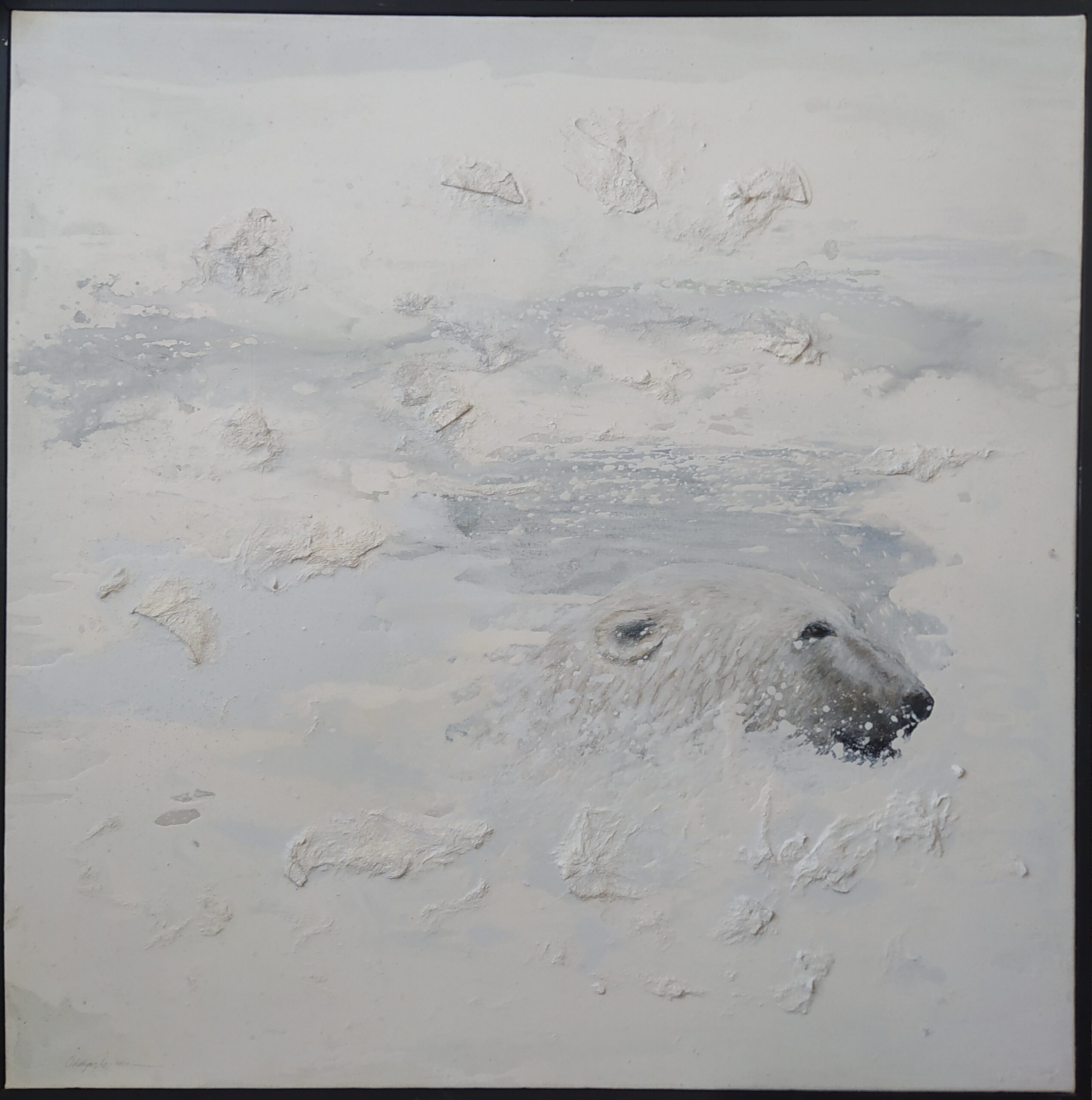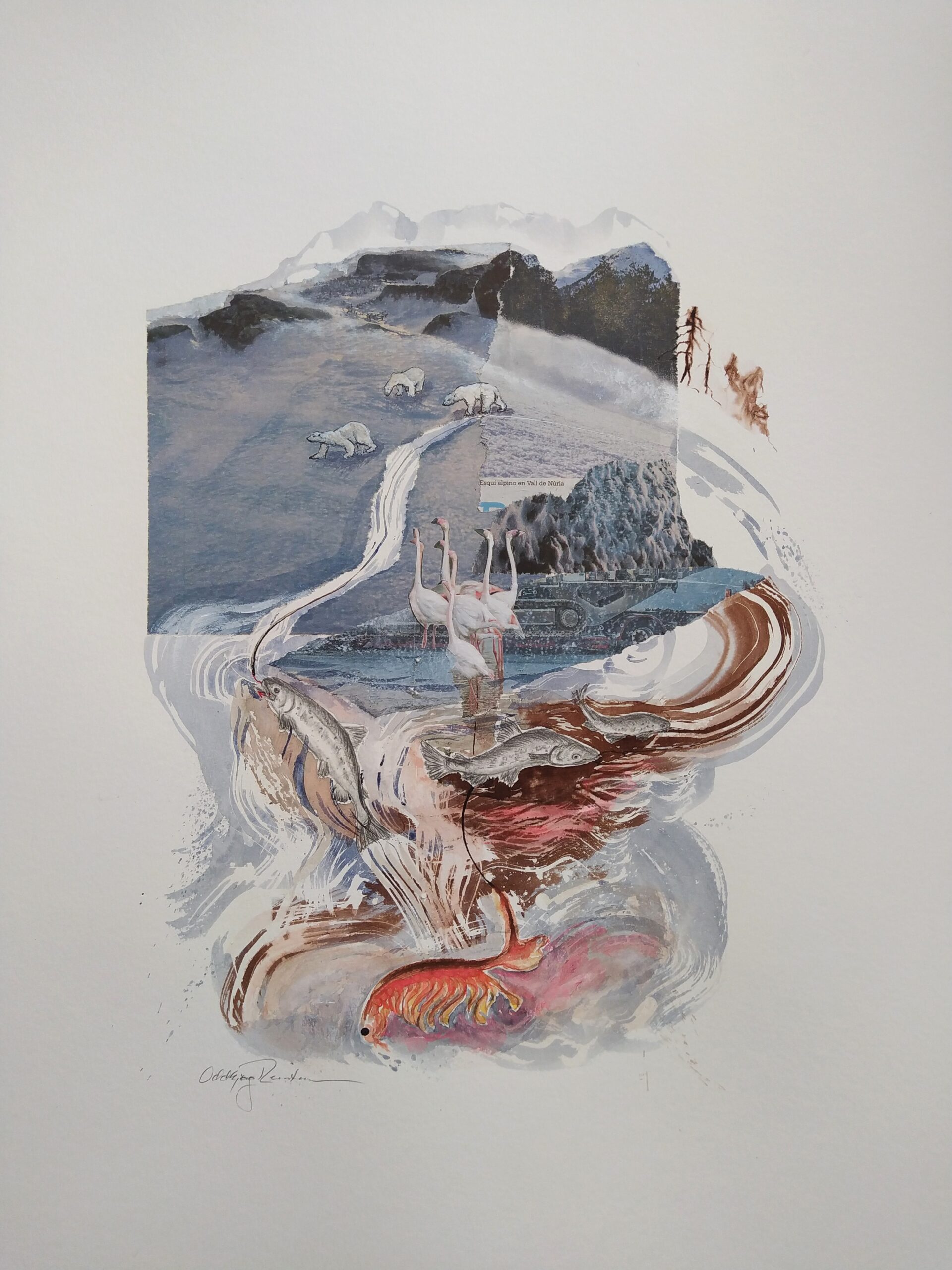 Les espèces en danger et le changement climatique représentent le cœur de mon travail et la situation de plus en plus alarmante intensifie ma volonté d’exprimer et partager ces inquiétudes par les médiums le plus directes et efficaces pour moi : la peinture et le dessin, mais aussi des collages de matériaux hétéroclites trouvés.