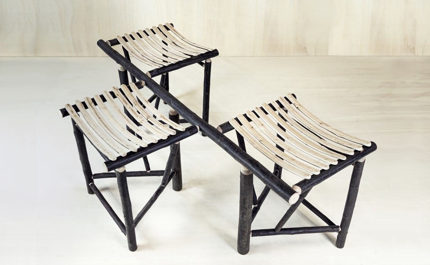 Les deux créateurs déclinent aujourd’hui ce tabouret en un banc trois places.