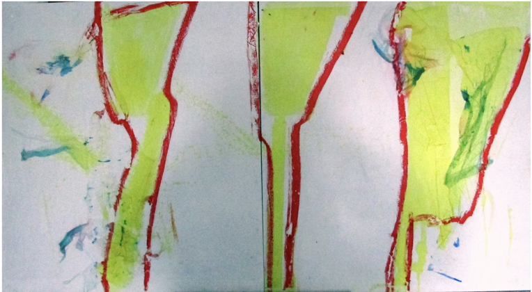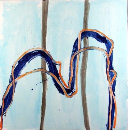 Parfois, quelques encres donnent un peu plus de nuances à la peinture et parfois également, l’artiste ajoute quelques collages qui se superposent aux couleurs déjà appliquées sur la toile pour les masquer en partie.