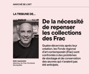 Une tribune d’Eric Mangion, directeur du Frac Occitanie-Montpellier dans le magazine Beaux-Arts, avril 2026