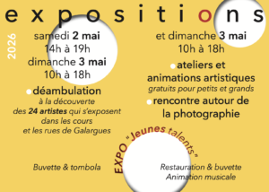 D’autre part, plus d’une vingtaine d’artistes exposeront leurs créations dans une quinzaine de lieux. Les expositions et les animations se dérouleront dans les ateliers des artistes ou dans les cours que des Galarguois ont mises à disposition des artistes.